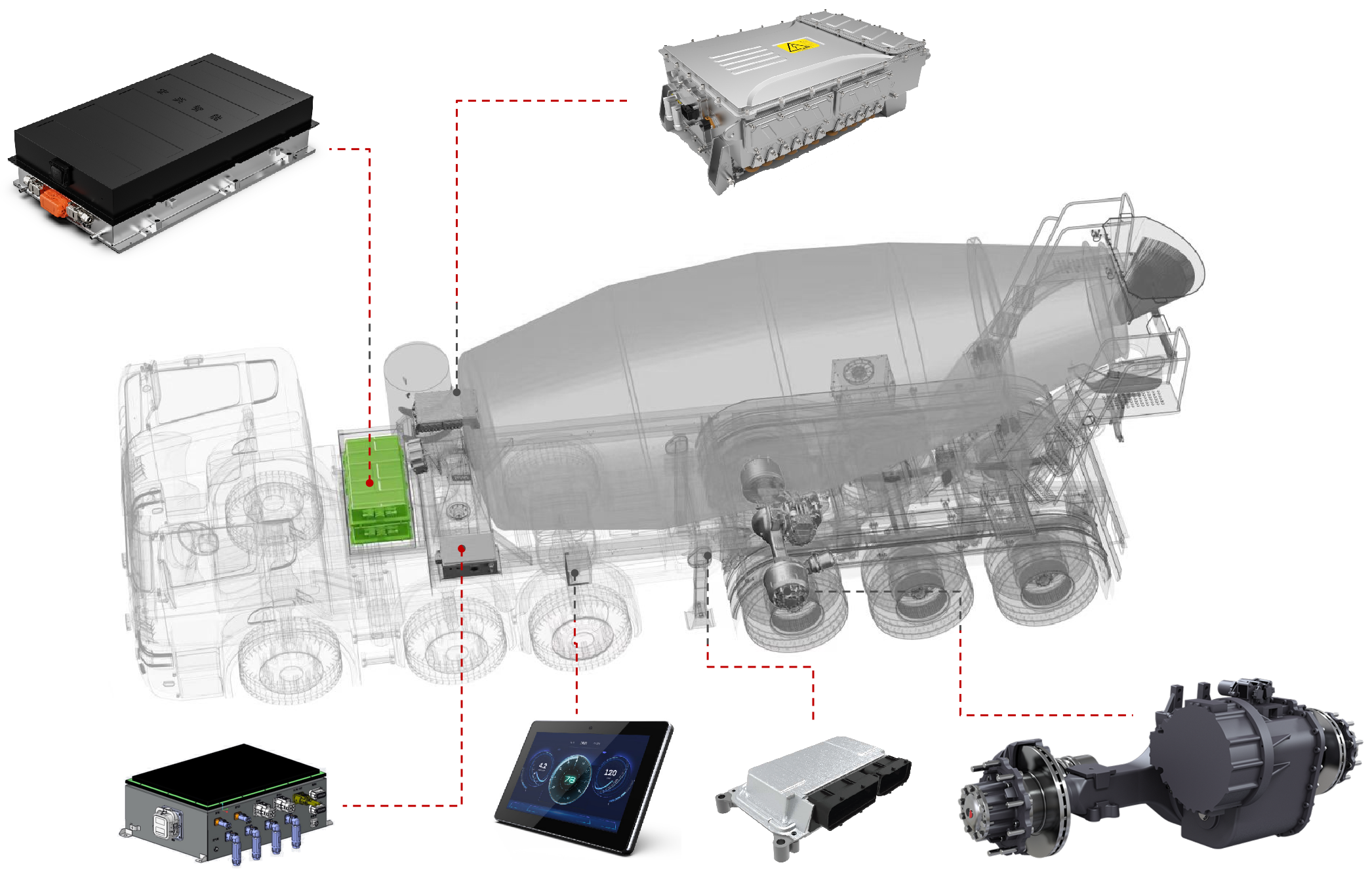 展会上,金年会智能的智电一体化解决方案引起了广泛关注。工程师团队在现场为参展观众详细介绍了混合动力牵引搅拌半挂车的系统方案。该方案基于金年会智能历经多年开发的eMagi智电平台,针对牵引搅拌半挂车进行了定向开发,涵盖以下几个方面: